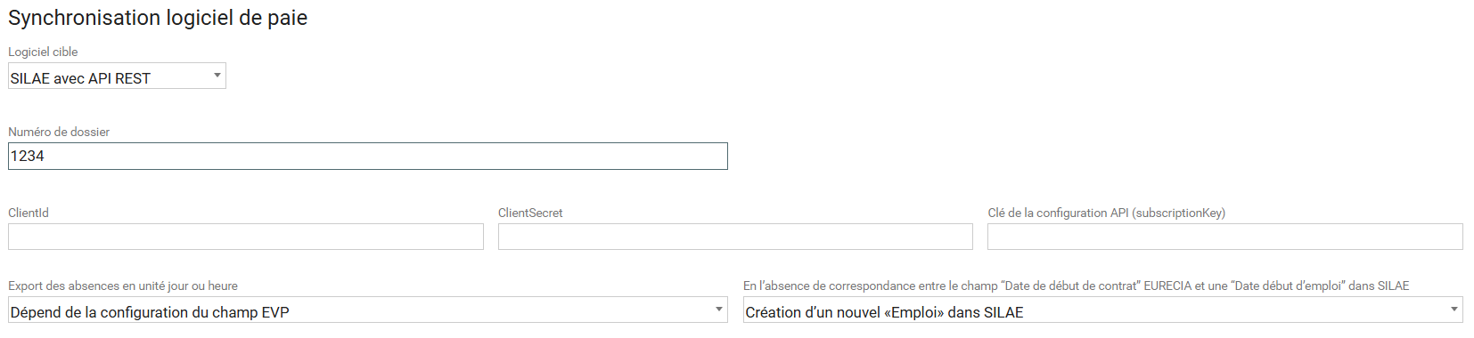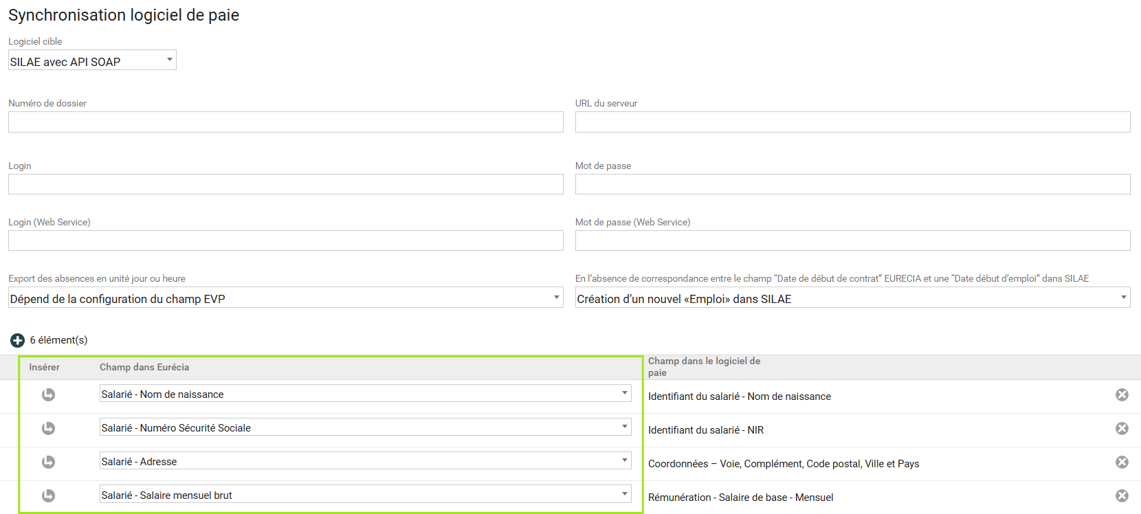 Les champs présents dans Eurécia doivent être associés avec ceux du logiciel de paie SILAE.