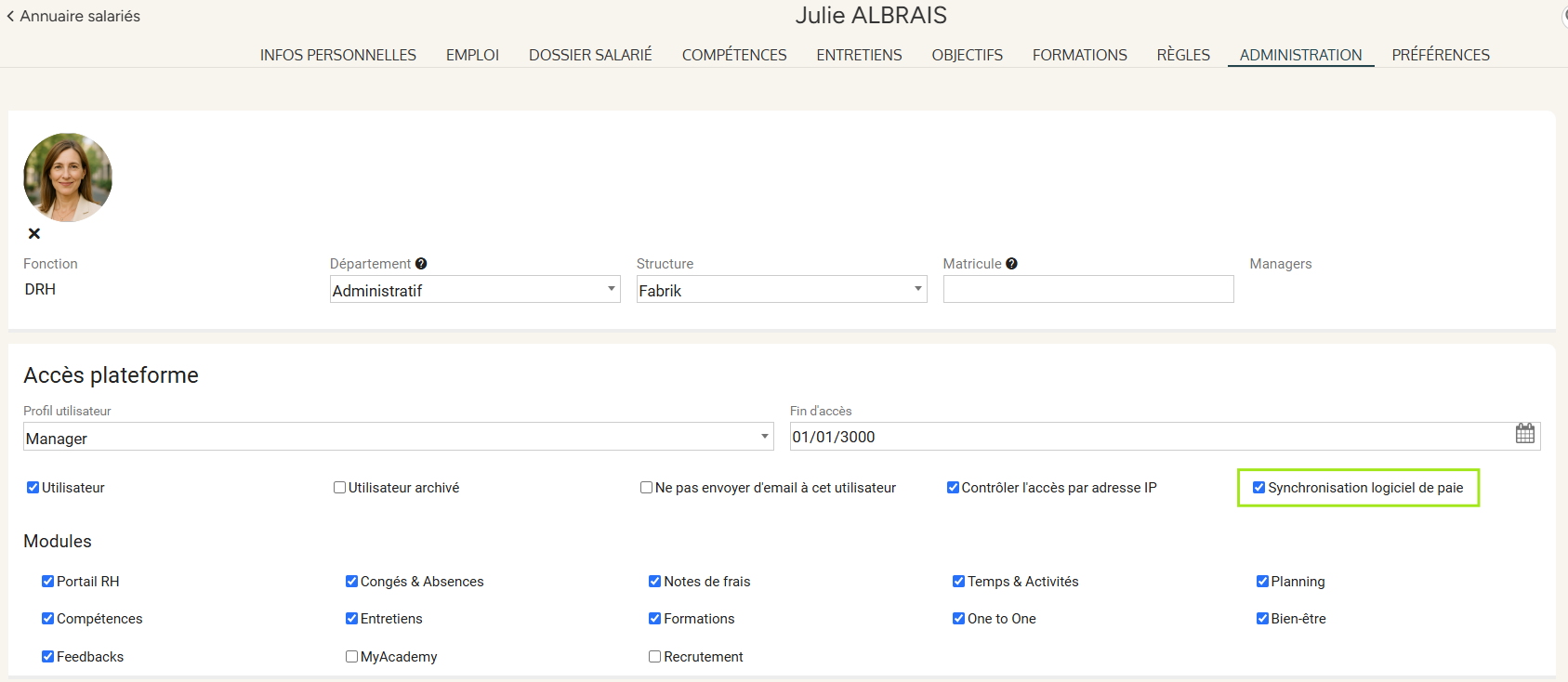 - la case 'Synchronisation logiciel de paie' doit être cochée dans l'onglet 'Administration' :