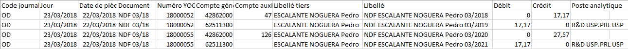 Selon les lignes : compte de charge, compte de TVA ou compte tiers centralisateur du salarié |