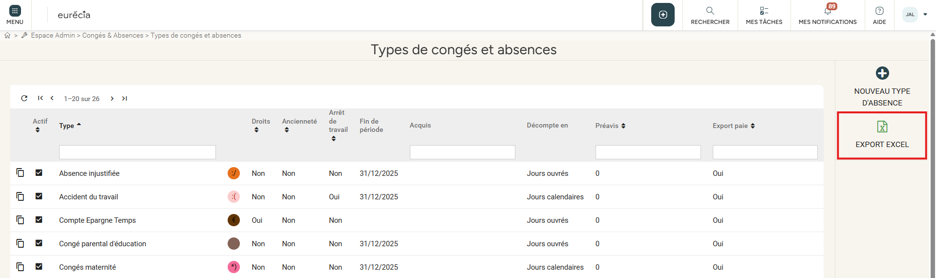 Cliquer sur le logo Excel en haut à droite pour exporter l'ensemble des types de congés.
