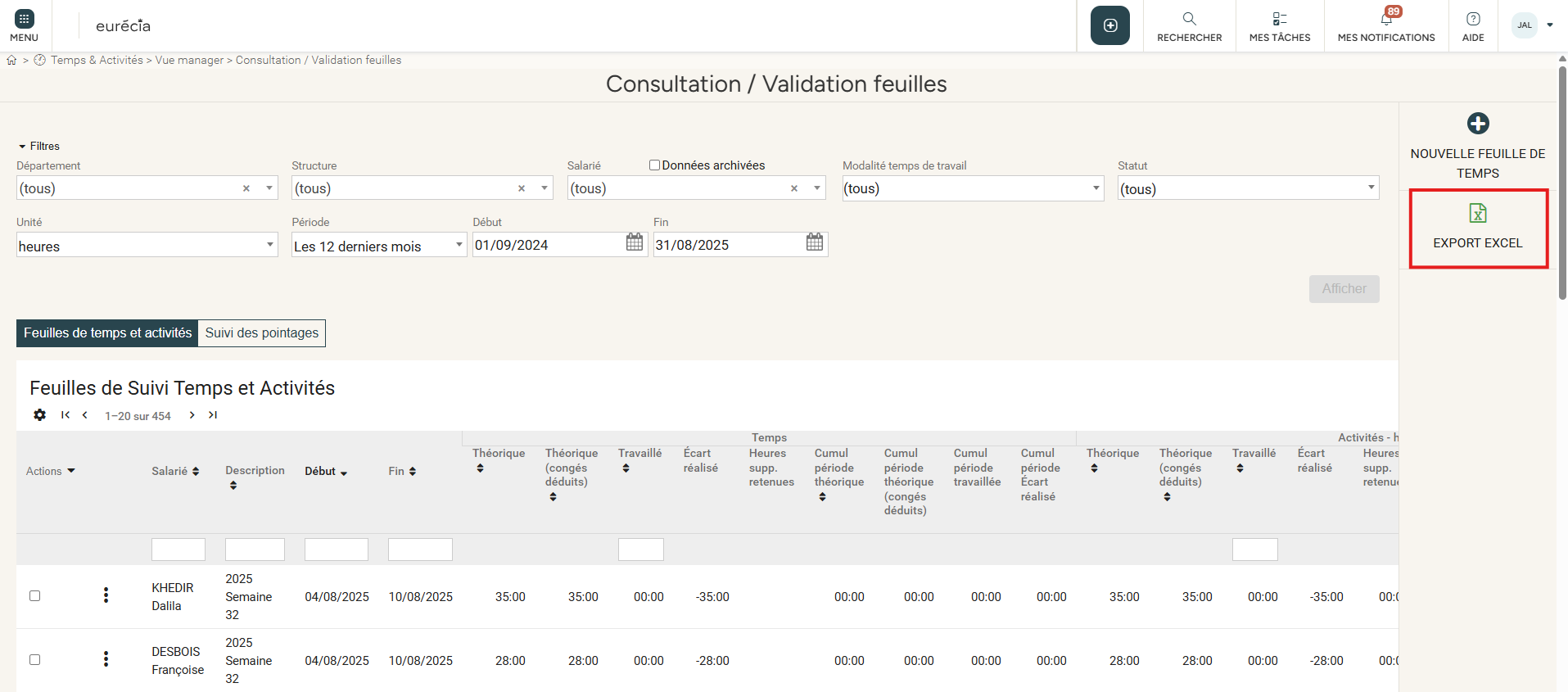 Sélectionner les filtres adéquats pour exporter l'ensemble des feuilles de temps (par département, par structure, pour tous les salariés, tous les statuts, sur une période donnée, etc.).