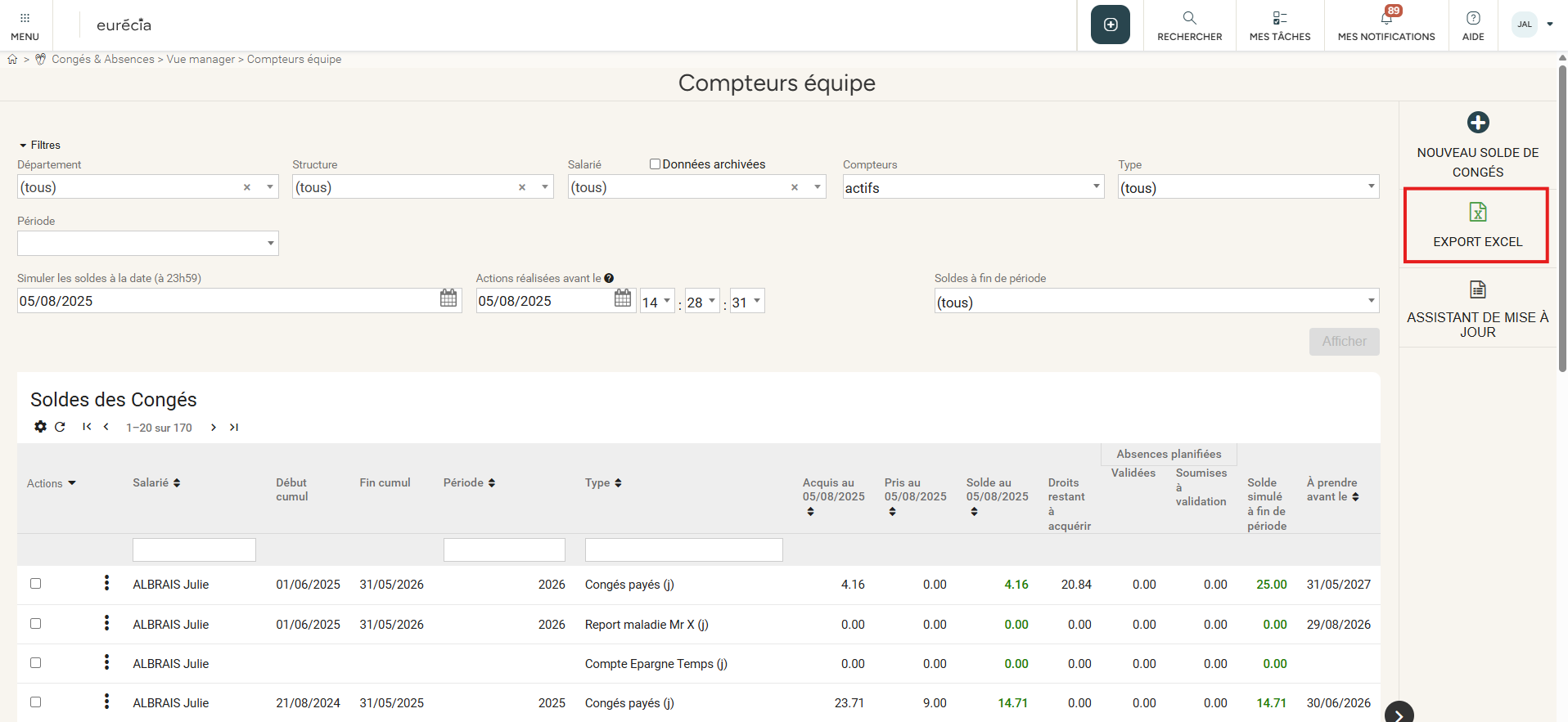 Cliquer sur le logo Excel en haut à droite pour exporter l'ensemble des compteurs de congés.