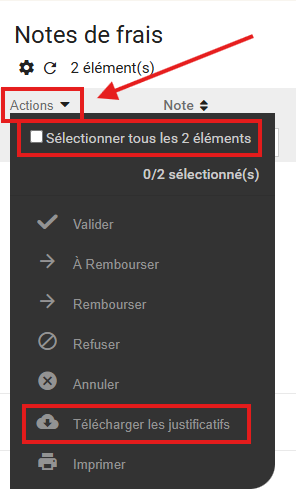Cliquer ensuite sur le bouton Actions, puis sélectionner tous les éléments et télécharger les justificatifs :