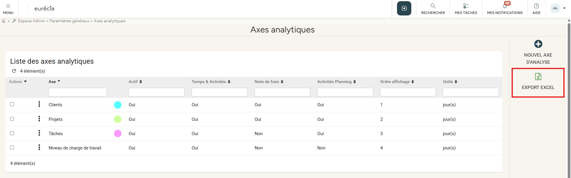 Cliquer sur le logo Excel en haut à droite pour exporter l'ensemble des axes analytiques.