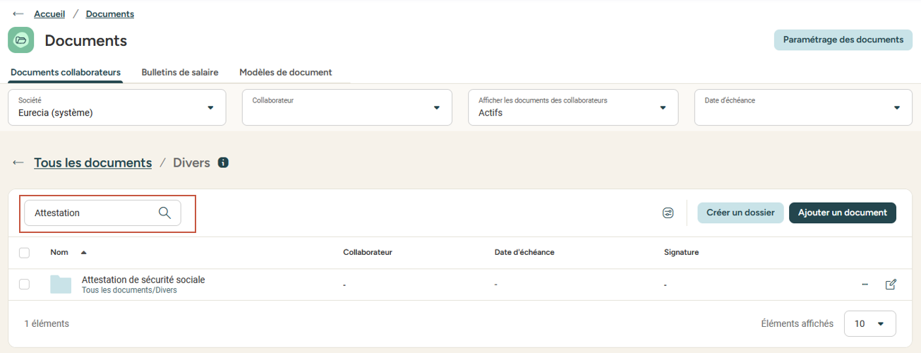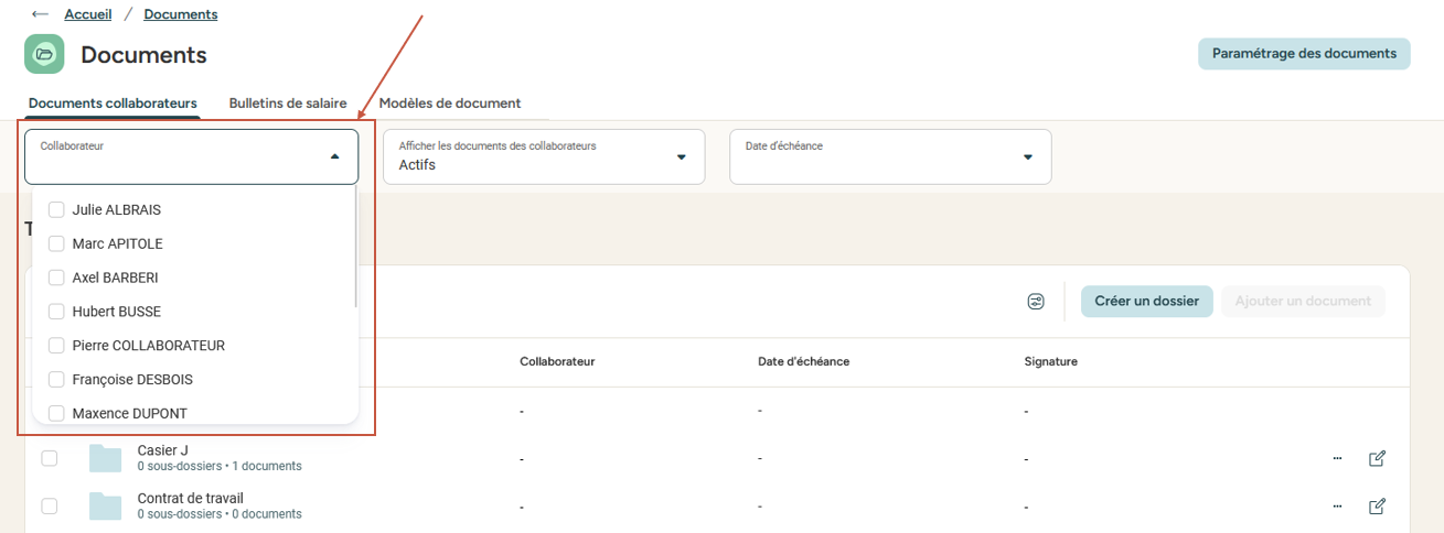 Après avoir créé des dossiers et ajouté des documents, il est intéressant de pouvoir consulter les documents des collaborateurs et naviguer dans ce menu facilement ! La zone de filtrage et la barre de recherche prévues à cet effet vous seront alors d'une grande aide.