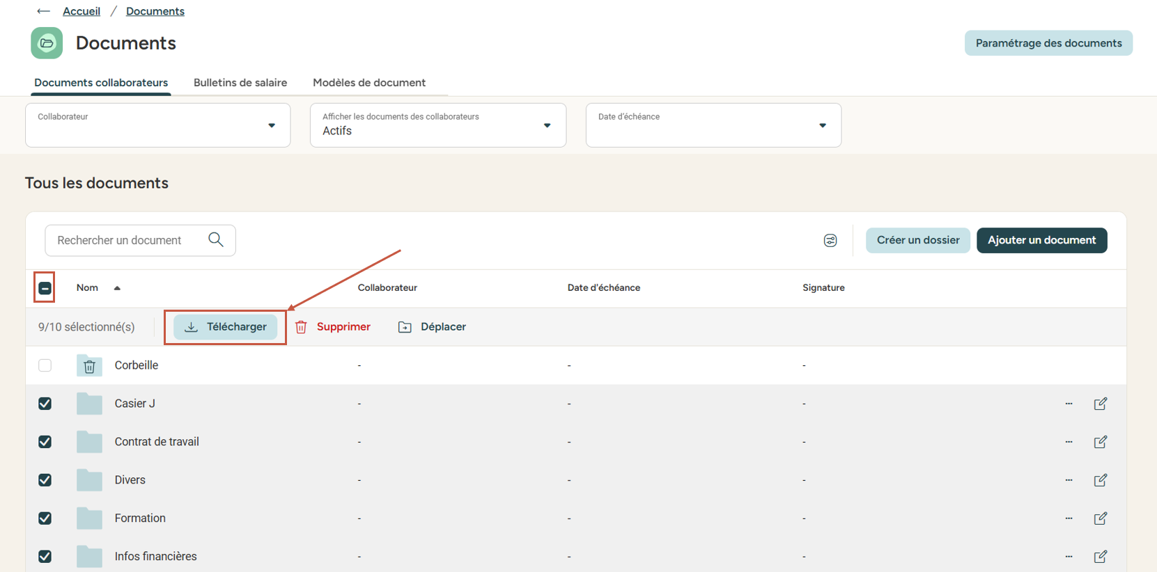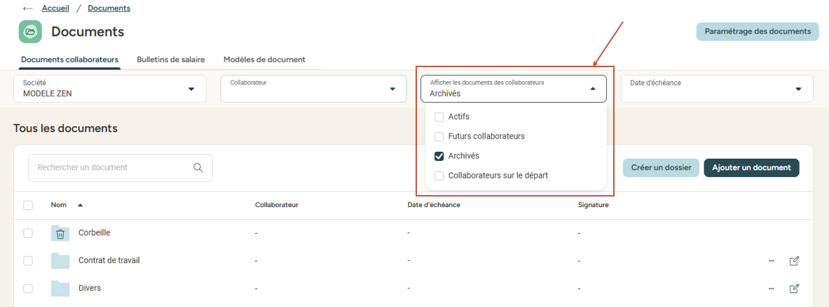 Pour consulter les données concernant les salariés archivés, il vous suffira de sélectionner "Archivés" grâce au filtre "Afficher les documents des collaborateurs" :