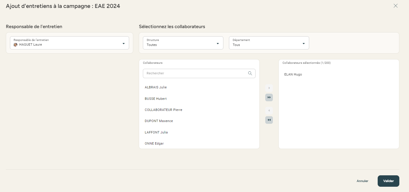 - Je sélectionne le ou les collaborateurs pour lesquels un entretien doit être crée en les faisant glisser dans le cadre de droite grâce aux flèches bleutées