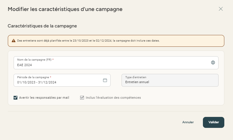 Je pourrais alors modifier la période et/ou le nom de la campagne avant de cliquer sur 'Valider':