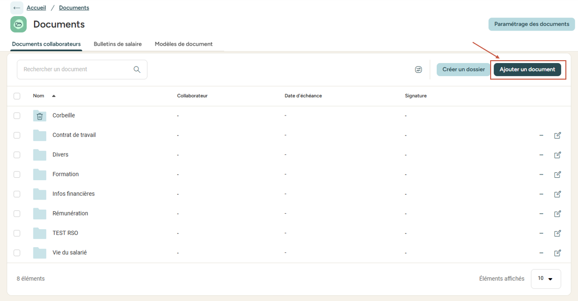Dans l'onglet "Documents des collaborateurs", le bouton "Ajouter un document" apparaît.