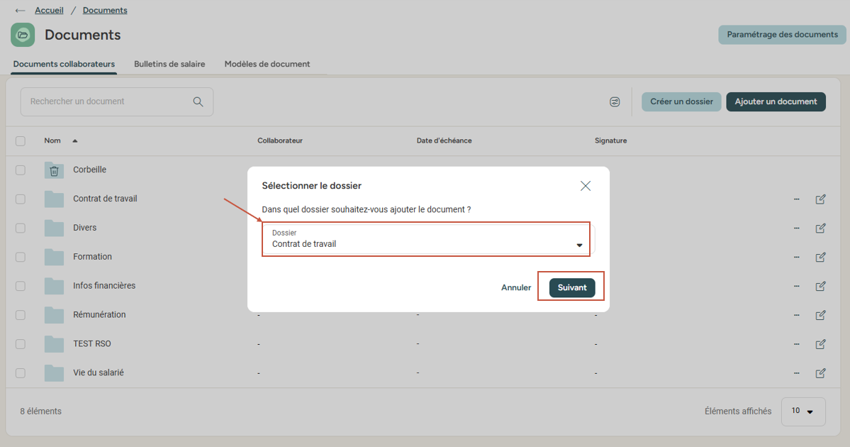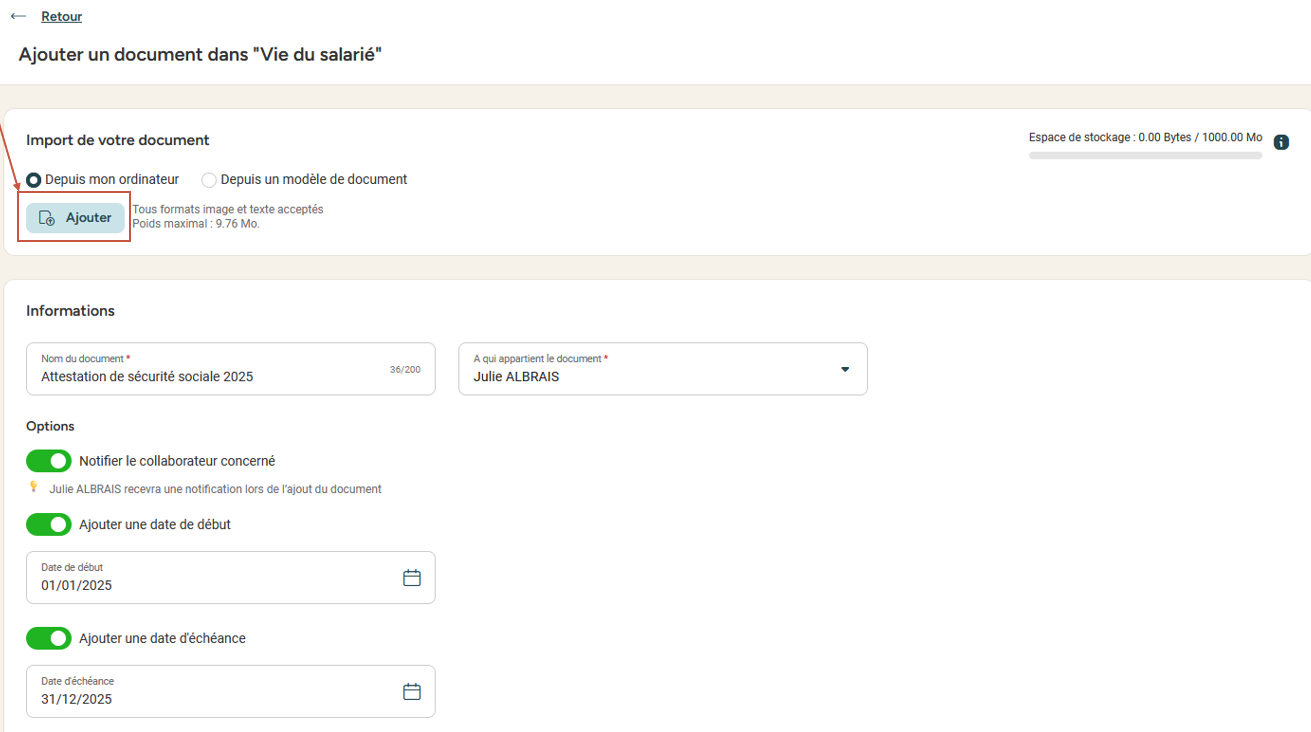 - De choisir de notifier ou non le collaborateur concerné de l'ajout de ce document dans son espace dédié,