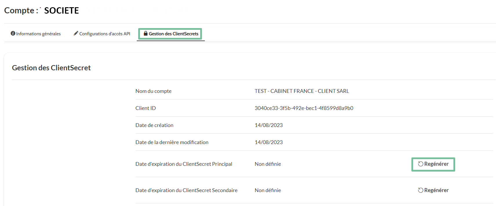 - ClientSecret : doit être généré depuis l'onglet "Gesion des ClientSecrets" de votre compte API :