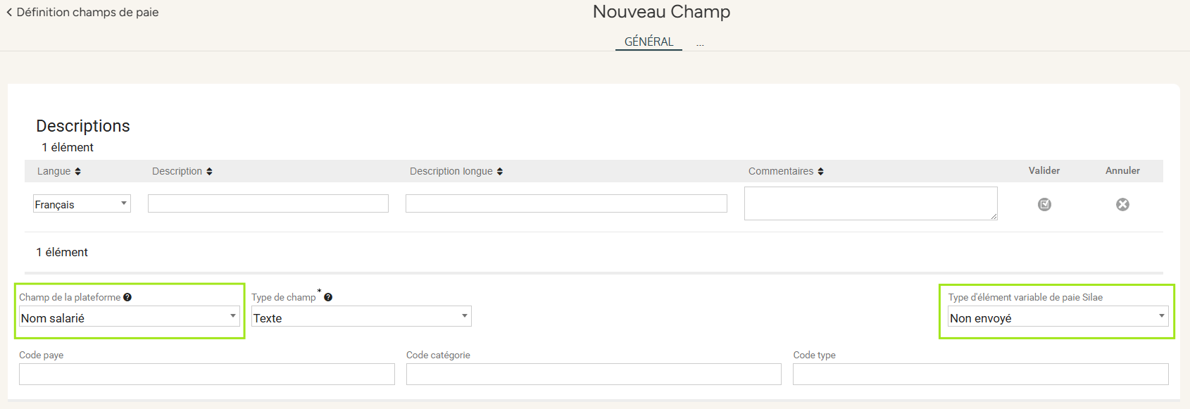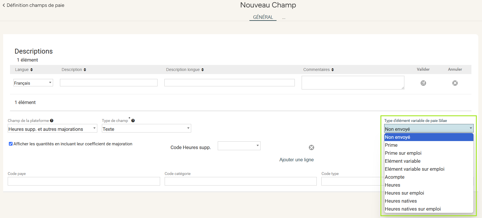 Le type d'élément variable de paie SILAE choisi ici doit correspondre à la catégorie de destination de l'élément dans SILAE.