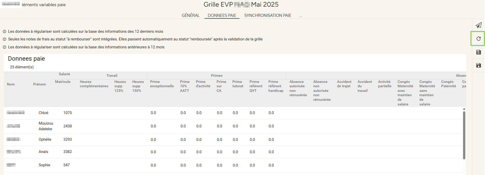 Toutes les données d'une grille EVP sont rafraîchies à chaque ouverture de la grille. Les régularisations sont calculées sur la base des informations des 12 derniers mois.