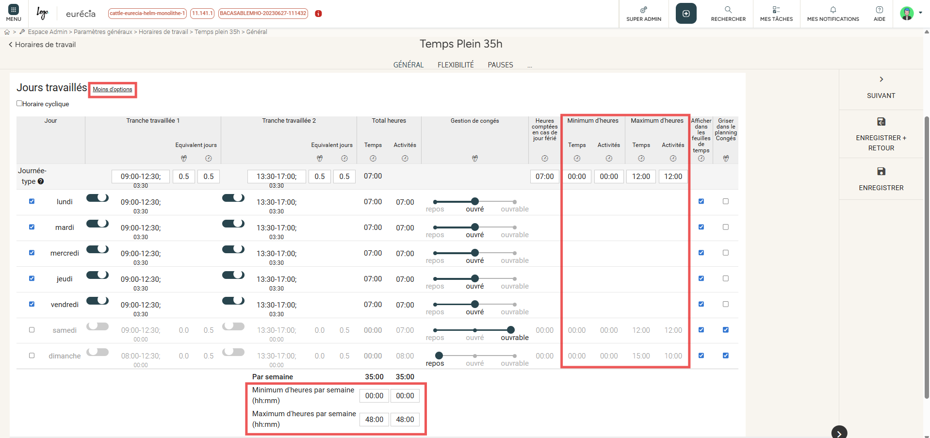 Le nombre minimum et maximum d'heures travaillées par jour ou par semaine est défini dans chaque horaire de travail.