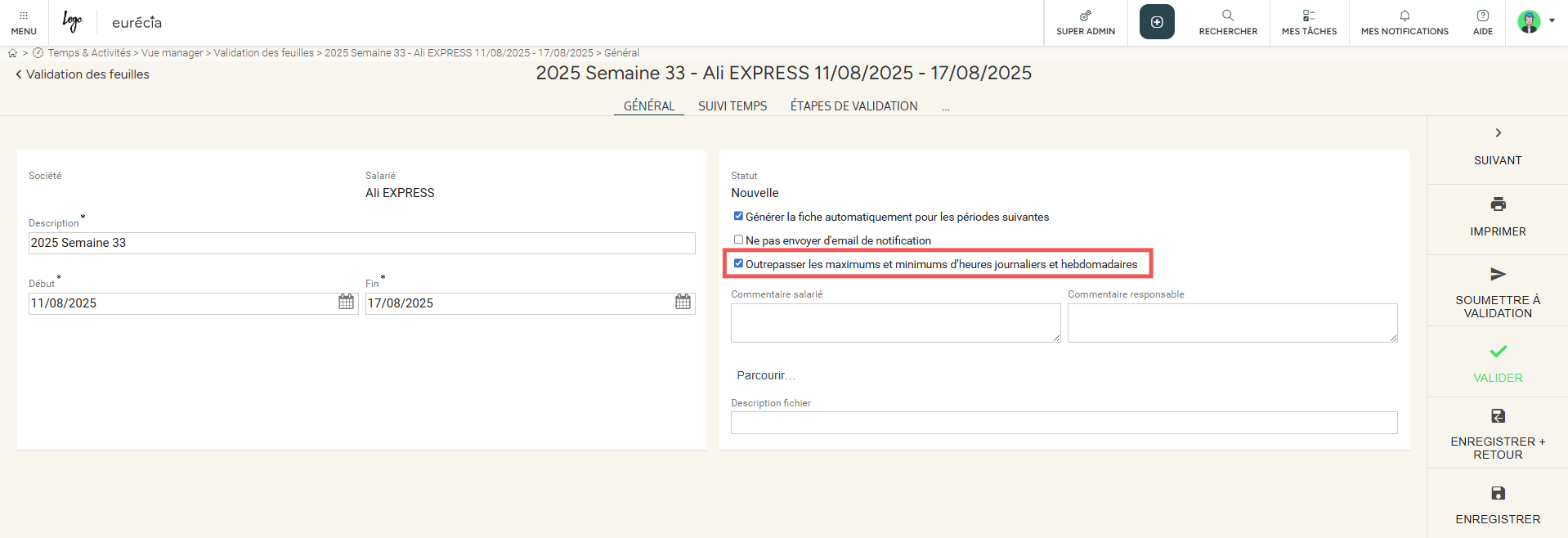 Lorsque l'un de vos collaborateurs saisit des heures de travail ne respectant pas ces limites, un message d'erreur s'affiche et empêche l'enregistrement et la validation de la feuille :