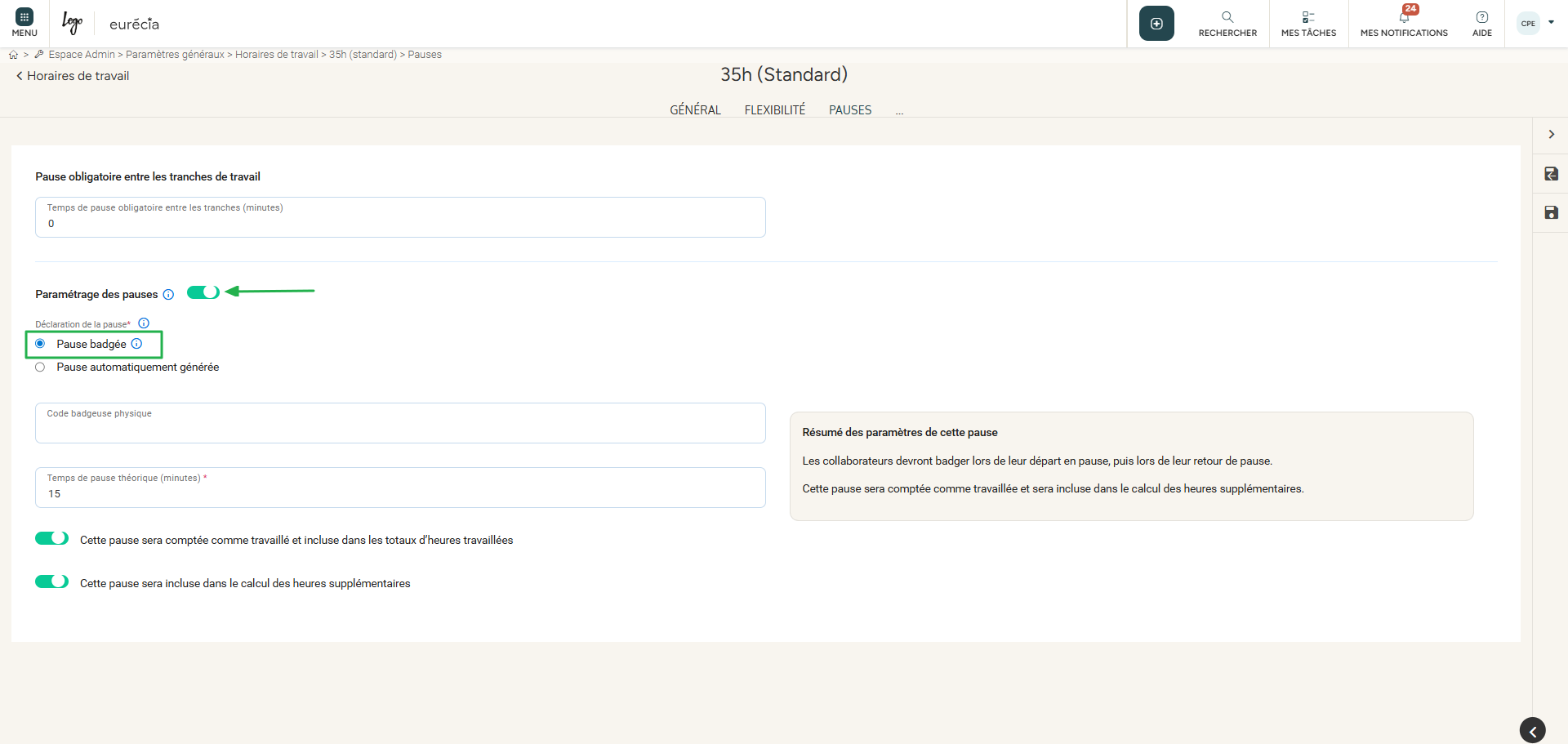 - Si ma pause doit être comptée comme travaillé et incluse dans le total des heures travaillés, je peux activer le bouton "Cette pause sera comptée comme travaillé et incluse dans les totaux des heures travaillées"