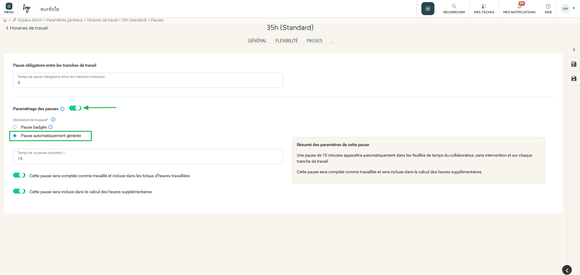 - Dans déclaration de la pause, je choisis 'pause automatiquement générée' : la pause sera automatiquement générée dans les feuilles de temps sur chaque tranche travaillée