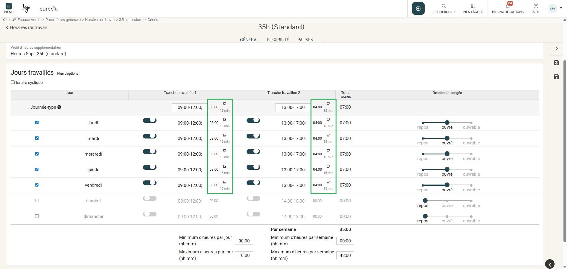 Accès : Espace admin > Paramètres généraux > Horaires de travail > Onglet 'Pauses'